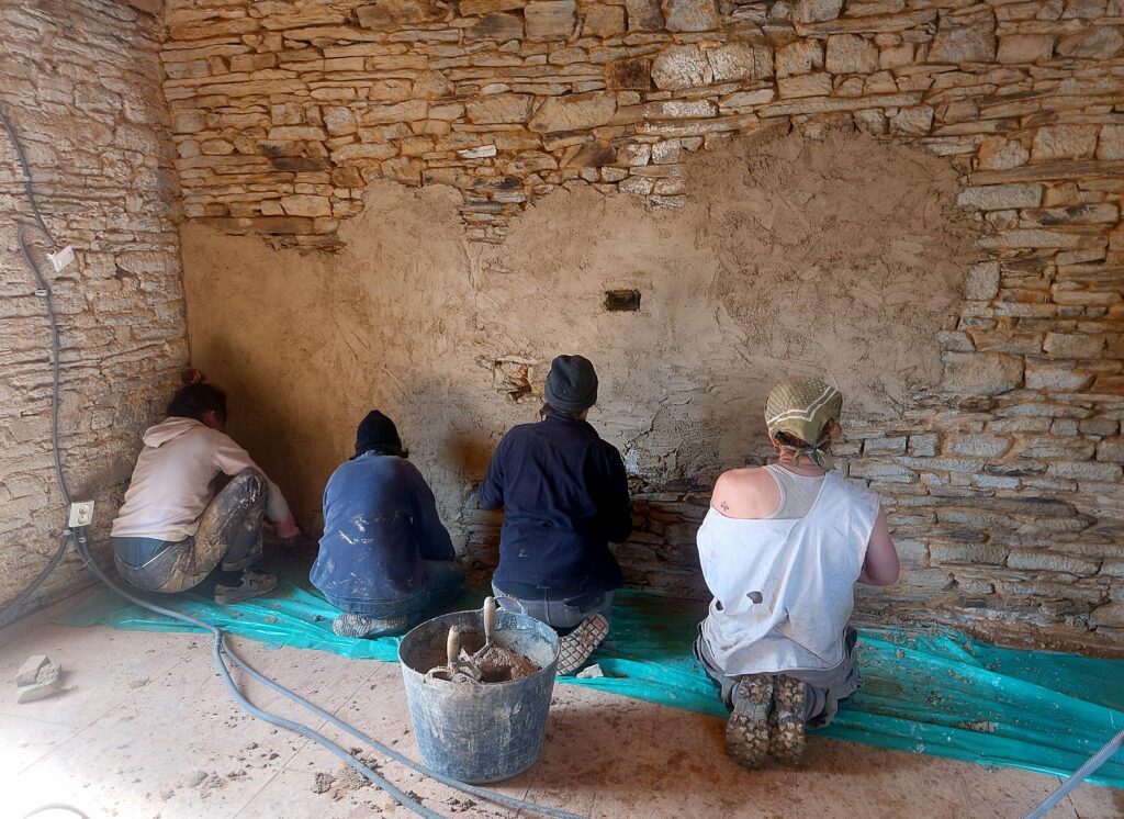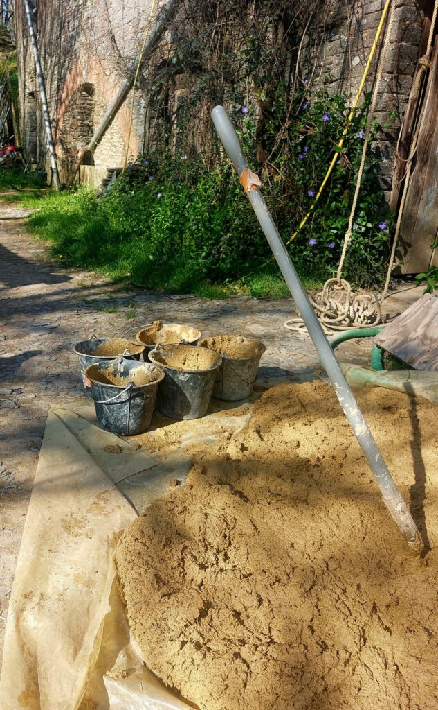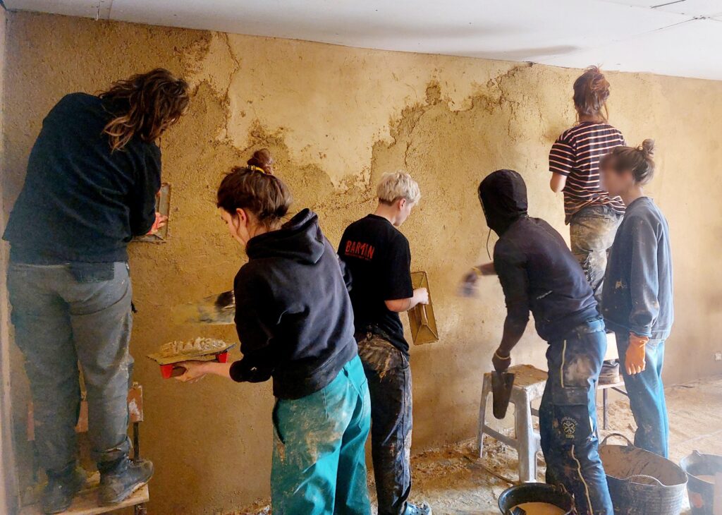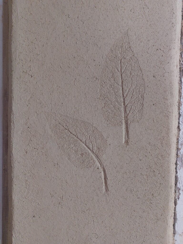Le chantier enduit terre paille du 18 au 22 mars c’était génial. Déjà parce que les enduits ç’est la vie et aussi parce que les chambres sont finies (et qu’il faisait trop beau)! Les murs sont lisses, pas tous très droits mais on préfère, toutes les prises sont pas complètement recouvertes ok, mais si c’était tout nickel on serait pas au Moulin. En tout cas on sent bien qu’l’équipe d’enduit a pris le coup de taloche, fait son entrée dans la science de la barbotine. On comprends mieux la matière, les mélanges, la temporalité, le séchage. Petit à petit la transmission se fait, les compétences infusent. Et ça laisse de la place au kiff. Quelques expérimentations, des empreintes de feuilles dans les murs, des motifs, ca y’est on est des artistes qui visent l’esthétique.
